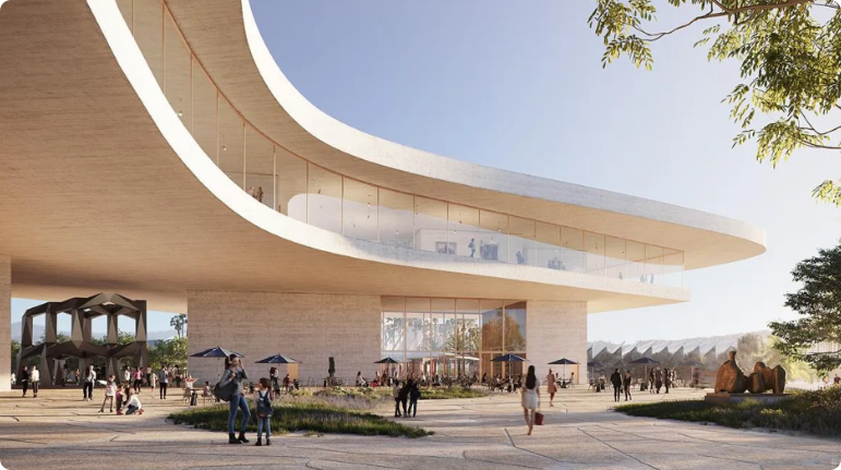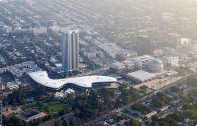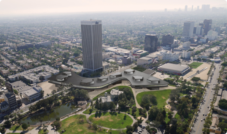 卒姆托设计的这座建筑从方案面世起便广受热议。设计如同桥梁般横跨洛杉矶威尔希尔大道(Wilshire Boulevard),由七个不规则的结构体支撑起以玻璃和混凝土构建的水平抬升的主体,形成高出街面近9米的展览层,以此取代四栋老旧的博物馆建筑。这座全新的展馆通过建筑与景观的再设计,重新构建LACMA与城市的关系,并提供超过1.4万平方米的公共开放空间。
